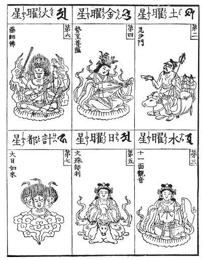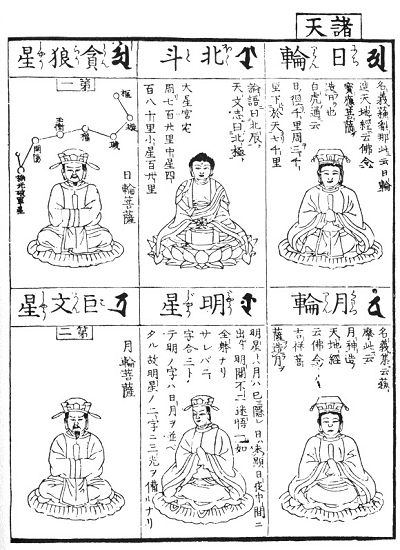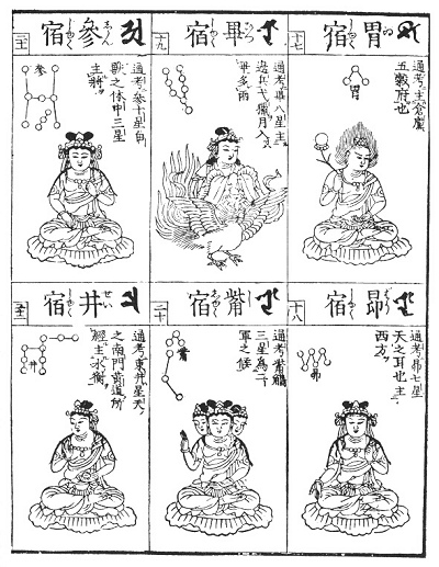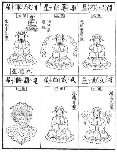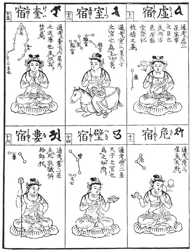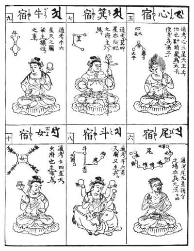 To the Chinese (as also in some respects to the Babylonians) the stars are actual presences who sway the destinies of mankind, and we reproduce here a series of illustrations from a Buddhist picture-book printed in Japan. They are based upon ancient traditions ultimately derived from Sumer and Accad, but we have at present no means to determine the question of their history, especially as to their fate in China. One thing, however, may be regarded as certain, viz., that their traditional forms are prior to the calendar reform of the Jesuits. Hence we must assume that they have been imported by the way on