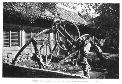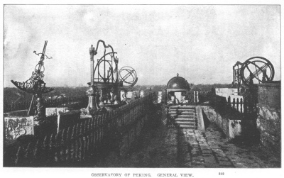 The gem of the collection is decidedly the spherical astrolabe which has been made after the instructions of Ko Chow King, astronomer royal of emperor Tai Tsu, of the Yüan dynasty, the founder of Peking. It is said to be a marvel of Chinese art. In the general view we notice a quadrant on the left-hand side between two light columns in French style. It is a present of King Louis XIV sent to the emperor Kang Hi in the seventeenth century. Among the instruments preserved in the shed there are some curios of great artistic and historical value. The whole observatory as it stood has always been regarded as one of the most noteworthy treasures of the Tartar capital of the Celestial Empire.