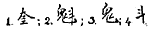 How then did it come about that scholars worshipped the K’uei in the Great Bear as the abode of the God of Literature? (It may be remarked in passing that a literary people could not have chosen a more appropriate palace for this god, since the Great Bear, the ‘Chariot of Heaven,’ is regarded as the centre and governor of the whole universe.) The worship, we saw, was at first that of the star K’uei, the apotheosized ‘homely,’ successful, but rejected candidate. As time went on, there was a general demand for a sensible, concrete representation of this star-god: a simple character did not satisfy the popular taste. But it was no easy matter to comply with the demand. Eventually, guided doubtless by the community of pronunciation, they substituted for the star or group of stars K’uei (1), 5 venerated in ancient times, a new star or group of stars K’uei (2), forming the square part of the Bushel, Dipper, or Great Bear. But for this again no bodily image could be found, so the form of the written character itself was taken, and so drawn as to represent a kuei (3) (disembodied spirit, or ghost) with its foot raised, and bearing aloft a tou (4) (bushel-measure). The adoration was thus misplaced, for the constellation K’uei (2) was mistaken for K’uei (1), p. 108 the proper object of worship. It was due to this confusion by the scholars that the Northern Bushel came to be worshipped as the God of Literature.