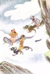 In haste the Prince donned his armour, mounted his black steed, and, spear in hand, dashed out of the west gate of the city. He pressed on his horse, which went swift as the wind, nor did he slacken speed till he came up with the water-stealing dragons, who still retained the forms in which they had appeared to him in his p. 234 dream. On a cart were the two identical baskets he had seen; in front of the cart, dragging it, was the old woman, while behind, pushing it, was the old man.