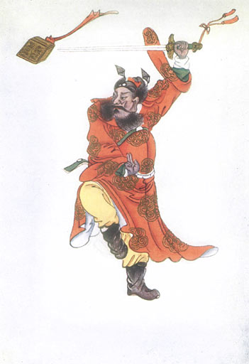 The following particulars are given concerning the President of the Ministry, whose name was Lü Yüeh. He was an old Taoist hermit, living at Chiu-lung Tao, ‘Nine-dragon Island,’ who became an Immortal. The four members of the Ministry were his disciples. He wore a red garment, had a blue face, red hair, long teeth, and three eyes. His war-horse was named the Myopic Camel. He carried a magic sword, and was in the service of Chou Wang, whose armies were concentrated at Hsi Ch’i. In a duel with Mu-cha, brother of No-cha, he had his arm severed by a sword-cut. In another battle with Huang T’ien-hua, son of Huang Fei-hu, he appeared with three heads and six arms. In his many hands he held the celestial seal, plague microbes, the flag of plague, the plague sword, and two mysterious swords. His faces were green, and large teeth protruded from his mouths. Huang T’ien-hua threw his magic weapon, Huo-lung Piao, and hit him on the leg. Just at that moment Chiang Tzŭ-ya arrived with his goblin-dispelling whip and felled him with a blow. He was able, however, to rise again, and took to flight.