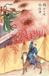 Resolved to avenge his defeat, he joined General Hsü Fang, who was commanding an army corps at Ch’uan-yün Kuan. Round the mountain he organized p. 242 a system of entrenchments and of infection against their enemies. Yang Chien released his celestial hound, which bit Lü Yüeh on the crown of his head. Then Yang Jên, armed with his magic fan, pursued Lü Yüeh and compelled him to retreat to his fortress. Lü Yüeh mounted the central raised part of the embattled wall and opened all his plague-disseminating umbrellas, with the object of infecting Yang Jên, but the latter, simply by waving his fan, reduced all the umbrellas to dust, and also burned the fort, and with it Lü Yüeh.