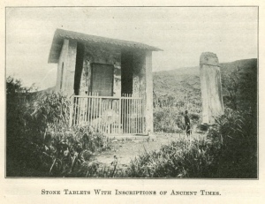 But the most renowned temple is about five miles northeast of this mountain, near to Shan-sing-kung, the town where the pope has his palace. Here, in a beautiful amphitheater-shaped valley, is a large group of temples. In these temple grounds are numerous stone tablets bearing inscriptions of ancient writers. These descriptions, however, are so defaced by the tooth of time that the deciphering of them is almost impossible. The center of this group is the Chief Hall, containing a colossal image of Yü Hwang-ti—the Pearly Emperor. He is emperor of all immortals. All the power of heaven and earth are supposed to be in his hands. Nothing is said of the time when he was on earth. His birthday and heaven's birthday are the same. To the Taoist worshiper he is the Supreme Ruler of the Universe. Dethrone him and