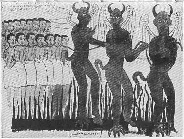 Sheol, the abode of the Devil and his angels. Three of Satan's chief devils dragging the souls of the damned with chains of fire through the fire-pits of hell