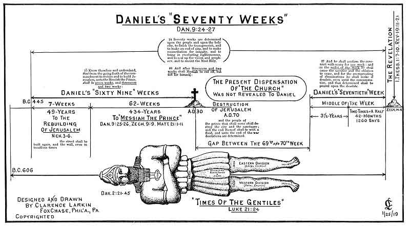 Now as the fulfilment of this "Six-Fold" purpose of the "SEVENTY WEEKS" synchronizes with the things that shall happen at the close of this Dispensation, and that are described in Rev. 6:1; 19:21, it is clear that the last, or "SEVENTIETH WEEK" of Daniel's "Seventy Weeks," covers the "TIME PERIOD" of Rev. 6:1; 19:21, and confirms the claim that that "Period" is Jewish and has nothing to do with the Church. To prove this it is only necessary to outline Daniel's "Seventy Weeks."