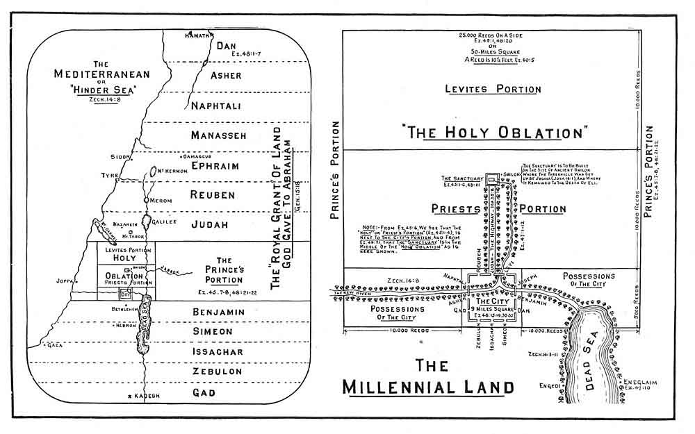 As we have seen the Temple or Sanctuary will be located in the centre of the "Holy Oblation." A full description of the Temple and its courts is given in Ezek. 40:1; 44:31. No such building as Ezekiel so minutely describes has ever yet been built, and so the prophecy cannot refer to either Zerubbabel's or Herod's Temple, and as there is to be no Temple in the New Jerusalem, it must be a description of the Temple that is to be on the earth during the Millennium. That it does not belong to the New Earth is also clear, for the land in which it is located is bounded by the Sea, and the waters that flow from it, flow "into the Sea," but in the New Earth there is "no more sea." Rev. 21:1. This is still further confirmed by the Prophet's mention of the "desert," the "River Jordan," the "Mediterranean Sea," and other localities that will not be found on the New Earth after its renovation by fire.