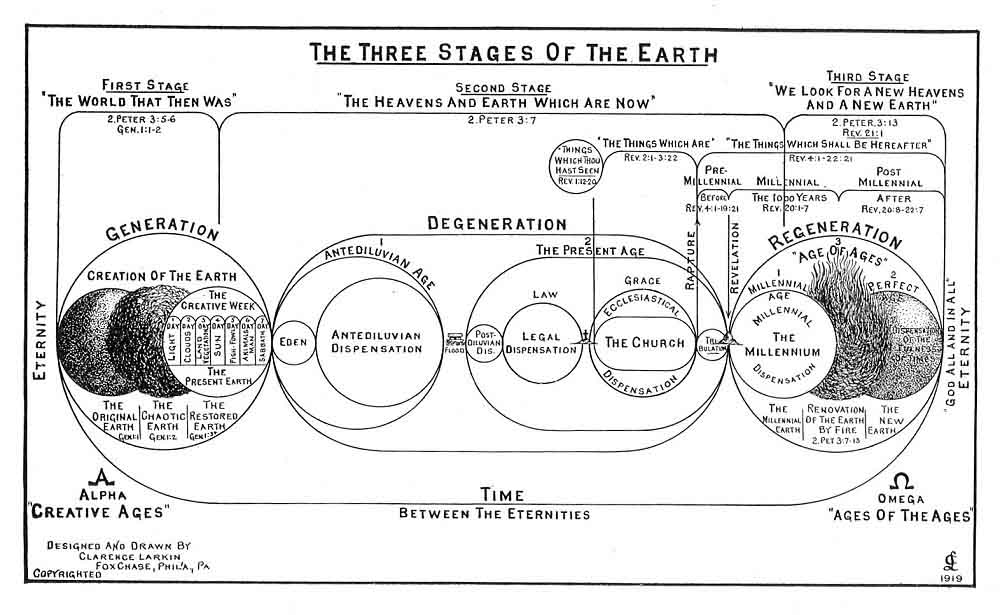 [paragraph continues] NEW HEAVEN AND A NEW EARTH." 2. Pet. 3:13. These words of Peter reveal the fact that this Earth is to pass through 3 stages. First the Original Earth that "perished" by WATER. Second the Earth that is now, that is to be renovated or cleansed by FIRE. And the New Earth that is to exist forever. See the Chart "The Three Stages of the Earth."