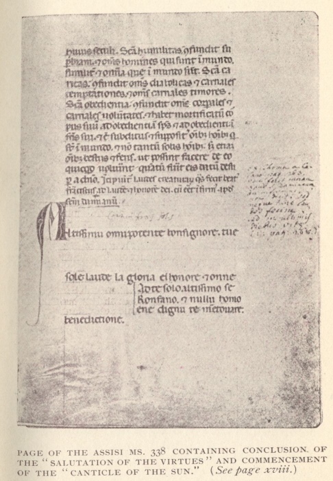 PAGE OF THE ASSISI MS. 338 CONTAINING CONCLUSION OF THE "SALUTATION OF THE VIRTUES" AND COMMENCEMENT OF THE "CANTICLE OF THE SUN." (See page xviii.