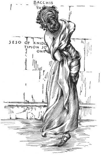 Diagonal folds furrowed the little that could be seen of her body through the light tissue; one of her elbows thrust out under the close tunic and the other arm, which she had left bare, carried the long train so it would not drag in the dust.