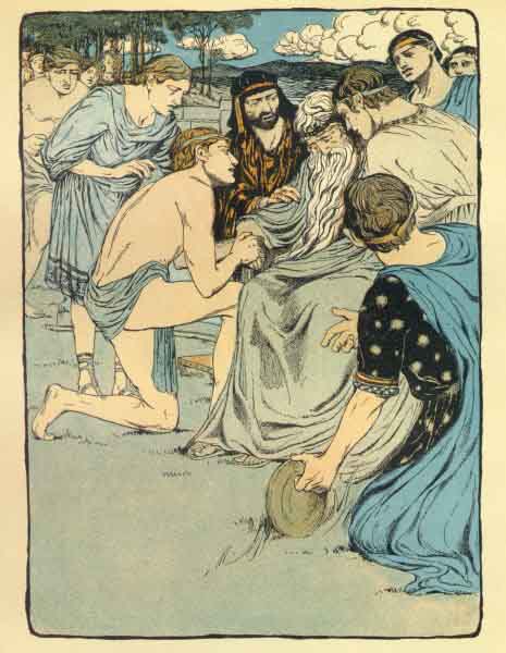 Then he left his galley on the beach, and went up as of old; and he embraced his mother, and Dictys his good foster-father, and they wept over each other a long while, for it was seven years and more since they had met.