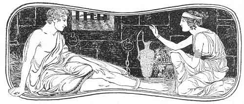 Then Theseus laughed, and said, "Am I not safe enough now?" And he hid the sword in his bosom, and rolled up the clue in his hand; and then he swore to Ariadne, and fell down before her, and kissed her hands and her feet; and she wept over