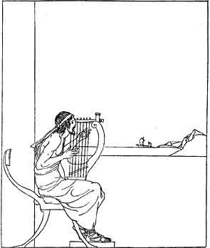 Phemius came and the wooers called upon him to sing them a tale. And the minstrel, in flowing verse, began the tale of the return of the Kings and Princes from Troy, and of how some god or goddess put a trouble upon them as they left the City they had taken. And as the minstrel began the tale, Penelope, Telemachus lady-mother, was coming down the stairs with two hand-maids beside her. She heard the words he sang, and she stood still in her grief and drew her veil across her face. O Phemius, she cried, cease from that story that ever wastes my heart--the story that has brought me sorrow and that leaves me comfortless all my days! O Phemius, do you not know other tales of men and gods that you might sing in this hall for the delight of my noble wooers?