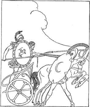 Then Hector sprang to the onslaught. Leaping into his chariot he led the Trojans on. Nine captains of the Greeks he slew in the first onset. Now their ranks would have been broken, and the Greeks would have fled back to their ships if Odysseus had not been on that wing of the battle with Diomedes, the great horseman. Odysseus cried out, "Come hither, Diomedes, or verily Hector will sweep us across the plain and bring the battle down to our ships."
