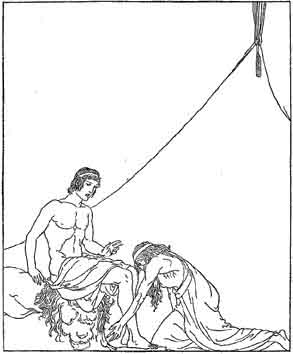So he spoke and departed and King Priam went within the hut. There great Achilles was sitting and King Priam went to him and knelt before him and clasped the hands of the man who had slain his son. And Achilles wondered when he saw him there, for he did not know how one could have come to his hut and entered it without being seen. He knew then that it was one of the gods who had guided this man. Priam spoke to him and said, "Bethink thee, Achilles upon thine own father. He is now of an age with me, and perhaps even now, in thy far-away country, there are those who make him suffer pain and misery. But however great the pain and misery he may suffer he is happy compared to me, for he knows that thou, his son, art still alive. But I no longer have him who was the best of my sons. Now for thy fathers sake have I come to thee, Achilles, to ask for the body of Hector, my son. I am more pitiable than thy father or than any man, for I have come through dangers to take in my hands the hands that slew my son."