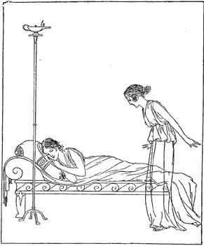 AND still Nausicaa stood, and Odysseus looking upon her was filled with reverence for her, so noble she seemed. I know not as I look upon thee, he said, whether thou art a goddess or a mortal maiden. If thou art a mortal maiden, happy must thy father be and thy mother and thy brothers. Surely they must be proud and glad to see thee in the dance, for thou art the very flower of maidens. And happy above all will he be who will lead thee to his home as his bride. Never have my eyes beheld one who had such beauty and such nobleness. I think thou art like to the young palm-tree I once saw springing up by the altar of Apollo in Delos--a tree that many marvelled to look at. O lady, after many and sore trials, to thee, first of all the people, have I come. I know that thou wilt be gracious to me. Show me the way to the town. Give me an old garment to cast about me. And may the gods grant thee thy wish and hearts desire--a noble husband who will cherish thee.