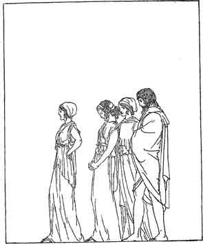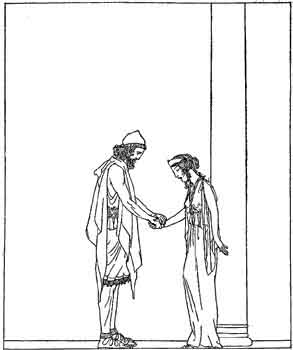 Now the maiden, Nausicaa, stood by a pillar as he passed, and she knew that she had never looked upon a man who was more splendid. She had thought that the stranger whom she had saved would have stayed in her fathers house, and that one day he would be her husband. But now she knew that by no means would he abide in the land of the Phæacians. As he passed by, she spoke to him and said, Farewell, O Stranger! And when thou art in thine own country, think sometimes of me, Nausicaa, who helped thee. Odysseus took her hand and said to her, Farewell, daughter of King Alcinous! May Zeus grant that I may return to my own land. There every day shall I pay homage to my memory of thee, to whom I owe my life.