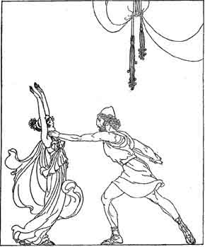 As she handed me the cup I drew my sword and sprang at her as one eager to slay her. She shrank back from me and cried out, "Who art thou who art able to guess at my enchantments? Verily, thou art Odysseus, of whom Hermes told me. Nay, put up thy sword and let us two be friendly to each other. In all things I will treat thee kindly."