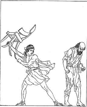 Sit there and eat thy meat in quiet, Antinous called out, or else thou wilt be dragged through the house by thy heels, and the flesh will be stripped off thy bones.