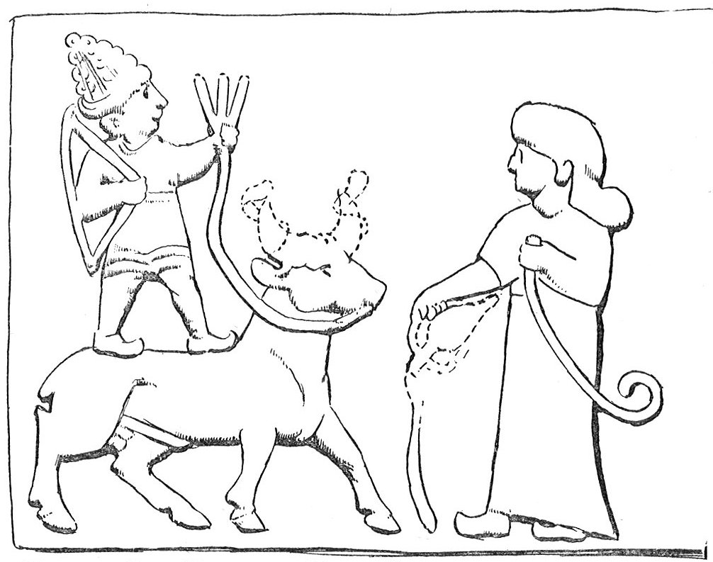 6:17 Our Fig. 1, L. H., pl. xliv., Liv. Annals Arch., ii. (1909), pl. xli (4). Cf. the familiar representation in glyptic art of Hadad leading a bull, e.g., Ward, Seal Cyl. of West Asia, Ch. xxx., figs. 456, 459, 461, etc.