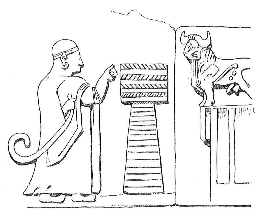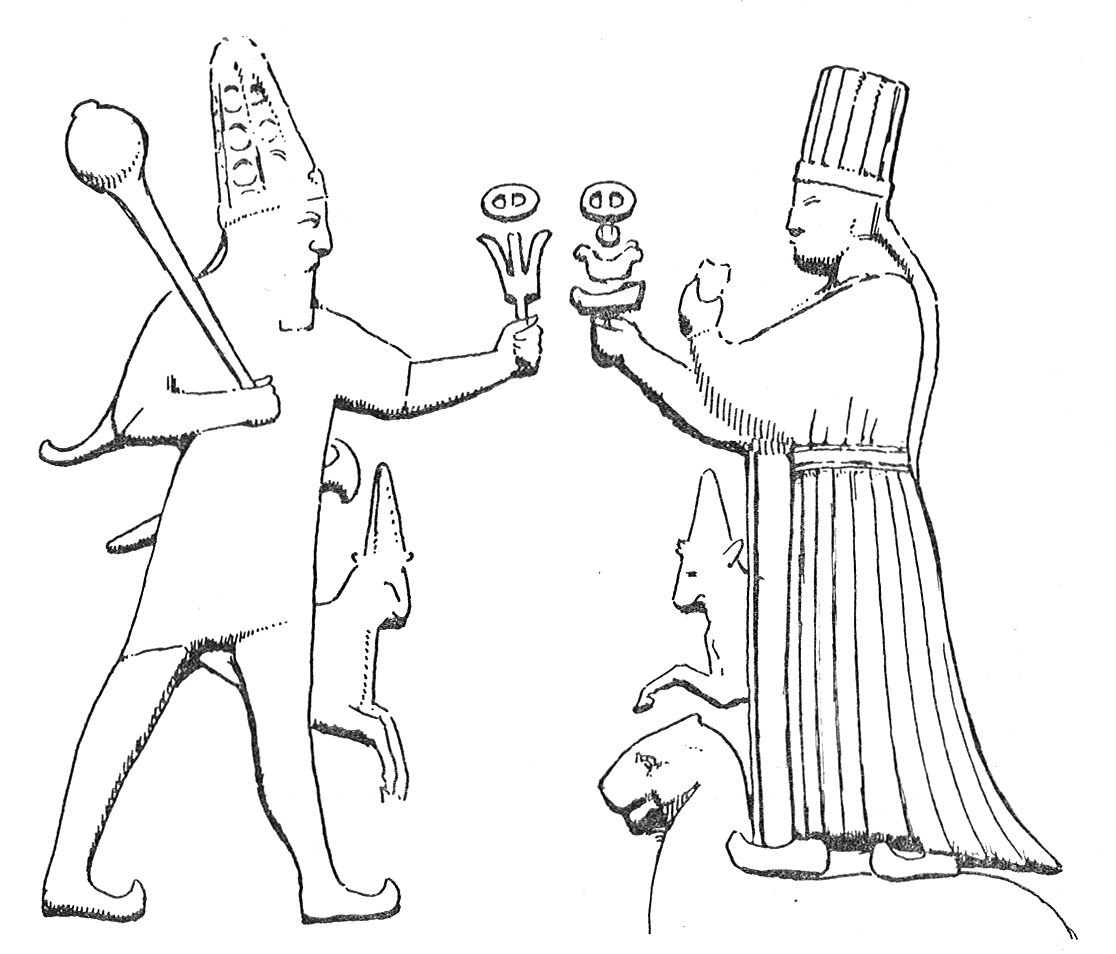 [paragraph continues] Priest and Priestess ministering at his altar. The Bull we have seen to be identified with the chief Hittite deity, which he seems here to replace.