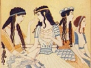 In addition to these figurines there are other evidences of the practice of religious ceremonials in the remote Aurignacian Age. In a cave at Cogul, near Lerida, in Spain, a quaint painting depicts several females, with "wasp waists" and bell-mouthed gowns reaching to their knees, dancing round a nude male figure. A phallus image of this culture stage has also been discovered.