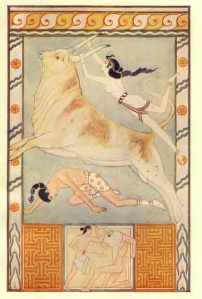 Greek legends regarding Crete take no account of the stag- and eagle-headed monsters. The Minotaur with bull's head and forelegs and human body and legs overshadowed them all. This fact is highly suggestive. Possibly the explanation is that the bull clan of Minos, which was established at Knossos, attained political supremacy over the whole island, with the result that its Minotaur became the chief deity. This would account also for the myths regarding the sea-bull forms of Poseidon and Zeus, and the notorious ceremonies associated with the bull-ring at Knossos. The Minos clan may have invaded and conquered the island. Some authorities are inclined to regard Minos as a conqueror. Plato says of Atlantis that it was governed by a warrior class which lived separately in the more elevated parts, and had "common rooms of entertainment". 1
