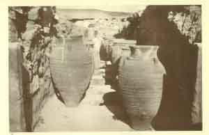 The Jars ("pithoi") are made of decorated earthenware and are of huge size. The "kaselles" are the small square openings in the floor of the magazine, evidently used at one time for storage purposes.