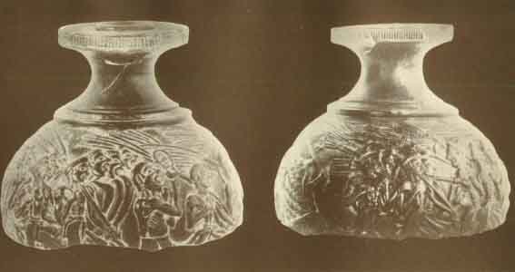When Cretan pottery attained its highest development in the Middle Minoan Period, it found a ready market in Egypt, which never produced ware so richly coloured or elaborately ornamented. In another direction the Cretans also surpassed their teachers. This was in the carving of vessels of stone. The island craftsmen began by imitating Nilotic forms, but used a softer material which allowed their artists freer play. The greatest surviving triumph of Cretan decoration on stone is the so-called Harvester vase from Aghia Triadha, near Phæstos. With consummate skill the artist depicted upon it a procession of men marching four deep, who are evidently taking part in some ceremony. One of the figures holds in his right hand an Egyptian sistrum, and is followed by a number of lusty singers. The drawing is entirely devoid of Egyptian conventionalism, and possesses a degree of naturalism which is typically Cretan. It is a spirited impression of an emotional group of human beings, and strikes quite a modern note. These stone vases were manufactured in Crete long after the new pottery had displaced stone and metal vessels as articles of everyday use. It is believed they were covered with thin layers of gold, and could have been purchased only by wealthy persons.