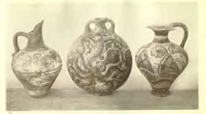 The pottery ranged from Middle Minoan times to the Late Minoan Period of decline. In a single room of a house in Main Street were found seventeen shapely "fillers". Some are of the type carried by the "cup-bearer" of the Knossian fresco, while others are of pear form with narrow necks, jutting lips, and small handles,