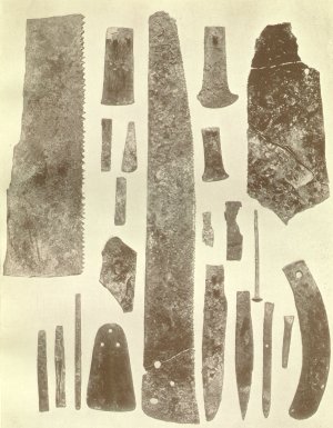The group shown above was taken from a carpenter's kit which had been concealed in a house in Gournia. The implements include axes, chisels, adzes, nails, &c.