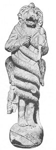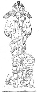 The statue here reproduced was found in the, mithræum of Ostia before mentioned, where C. Valerius Heracles and his sons dedicated it in the year 190 A.D. This leontocephalous figure is entirely nude, the body being entwined six times by a serpent, the head of which rests on the skull of the god. Four wings decorated with the symbols of the seasons issue from the back. Each hand holds a key, and the right in addition a long scepter, the symbol of authority, A thunderbolt is engraved on the breast. On the base of the statue may be seen the hammer and tongs of Vulcan, the cock and the pine-cone consecrated to Æsculapius (or possibly to the Sun and to Attis), and the wand of Mercury--all characteristic adjuncts of the Mithraic Saturn, and symbolizing the embodiment in him of the powers of all the gods. (T. et M., p. 238.)