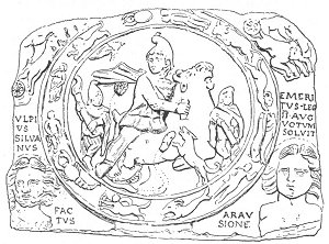 In the center the tauroctonous Mithra with the torch-bearers surrounded by the twelve signs of the Zodiac. In the lower corners busts of the Winds; in the upper corners the Sun on his quadriga and the Moon on a chariot drawn by bulls. The inscription reads: Ulpius Silvanus emeritus leg(ionis) II Aug(ustæ) votum solvit. (that is, honorably discharged at Orange). (T. et M., p. 389.)