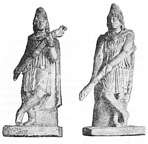 It was in this adventitious quality of the genius of the solar light that Mithra was best known in the Occident, and his monuments frequently suggest this borrowed character. It was customary to represent him between two youthful figures, one with an uplifted, the other with an inverted, torch. These youths bore the enigmatic epithets of Cauti and Cautopati, and were naught else than the double incarnation of his person (Figs. 18 and 29). These two dadophori, as they were called, and the tauroctonous hero formed together a triad, and in this "triple Mithra" was variously seen either the star of day, whose coming at morn the cock announced, who passed at midday triumphantly into the zenith and at night languorously fell toward the horizon; or the sun which, as it waxed in strength, entered the constellation of Taurus and marked the beginning of spring,--the sun whose conquering ardors fecundated nature in the heart of summer and the sun that afterwards, enfeebled, traversed the sign of the Scorpion and announced the return of winter. From another point of view, one of these torchbearers was regarded as the emblem of heat and of life, and the other as the emblem of