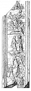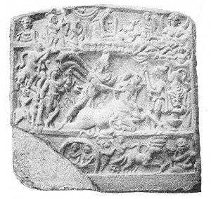Found at Virunum, in Noricum, and now in the Historical Museum Rudolfinum, Klagenfurt, Austria. The central part of the monument is entirely destroyed; the head of the sun-god from the left-hand corner alone having been left (see Fig. 11), The left border represents a Hellenized illustration of Ahura-Mazda's struggle with demons, after the manner of the gigantomachy. The lower part of the same fragment exhibits the birth of Mithra. (T. et M., p. 336.)