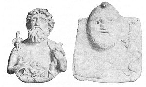The one to the left has the head of Jupiter (Silvanus?). The right hand holds a pine-cone, the left a branch entwined by a serpent. On the right shoulder is an eagle, and the breast is decorated with Mithraic figures in relief: the tauroctonous Mithra, a cup, the head of a ram, and a five-rayed disc. The right-hand bust is that of a bearded Oriental with Phrygian cap, holding in the right hand a pine-cone and in the left a torch entwined by a serpent--a crude piece of work and probably of Asiatic origin. (T. et M. Figs. 97 and 98, p. 260.)
