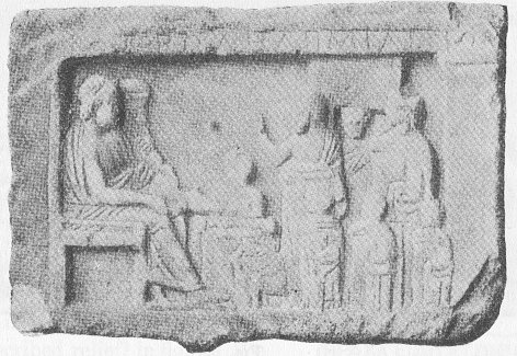 chosen because of the striking parallelism of its art type with that of the Peiraeus relief in fig. 3. The maker of this class of votive reliefs seems to have kept in stock designs of groups of pious worshippers which he could modify as required and to which the necessary god or snake and the appropriate victim could easily be appended. Midway in conception between the Olympian Zeus with his sceptre and the snake demon stands another relief 1 (fig. 6), also from the Peiraeus sanctuary. Meilichios is human, a snake no longer, but he is an earth god, he bears the cornucopia 2, his victim is the pig. He is that Meilichios to whom Xenophon offered the holocaust of pigs, praying for wealth; he is also the Zeus-Hades of Euripides. We might have been tempted to call him simply Hades or Ploutos but for the inscription [Κριτο]βόλη Διὶ Μειλιχίῳ, 'Kriloboule to Zeus Meilichios,' which makes the dedication certain.