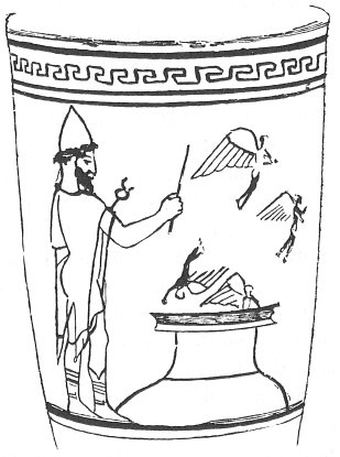 The attributes of Hermes in the vase-painting in fig. 7are noticeable. In one hand he holds his familiar herald's staff, the kerykeion. But, and this is the interesting point, he is not using it; it is held in the left hand, inert; it is merely attributive, present out of convention. The real implement of his agency in revoking the souls is held uplifted in the right hand; it is his rhabdos, his magic wand.