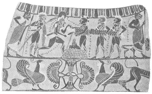 It is needless to dwell on all the details of what was in intent a three days' fair. A 'Pardon' in the Brittany of to-day affords perhaps the nearest modern analogy. The children have holidays, fairings are bought, friends are feasted, the sophists get their fees, the servants generally are disorganized, and every one down to the small boys, as many a vase-painting tells us, is more or less drunk. There is a drinking contest presided over by the King Archon, he who first drains his cup gets a cake, each man crowns his cup with a garland and deposits the wreath in keeping of the priestess of the sanctuary of Dionysos in the Marshes. On the day of the Cups takes place the august ceremony of the wedding of the wife of the King Archon to the god Dionysos. On that day alone in all the year the temple of Dionysos is opened 5.