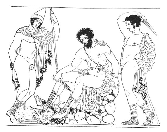 If we view the Choes as Χοαί, the Cups as Libations, the anomalous and, as it stands, artificial connection of Orestes with the festival becomes at once clear. At the drinking bout of the Choes, we learn from Athenaeus 1 and other authorities, the singular custom prevailed that each man should drink by himself. A mythological reason was sought to account for this, and the story was told 2 that Orestes, polluted by the blood of his mother, came to Athens at the time of the celebration of the Choes. The reigning king, variously called Pandion and Phanodemus, wished to show him hospitality, but religious scruple forbade him to let a man polluted enter the Sanctuaries or drink with those ceremonially clean. He therefore ordered the Sanctuaries to be shut and a measure of wine (χοῦς) to be set before each man severally, and bade them, when they had finished drinking, not to offer up the garlands with which they had been crowned in the Sanctuaries, because they had been under the same roof with Orestes; but he bade each man place his wreath round his own cup, and so bring them to the priestess at the precinct of the Limnae. That done, they were to perform the remaining sacrifices in the Sanctuary. From this, Athenaeus adds, the festival got the name of Cups. The mad Orestes in the Iphigenia in Tauris 3 tells the same tale and naïvely states that, though he was hurt by the procedure, he dare not ask the reason, knowing it all too well.
