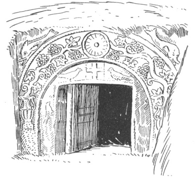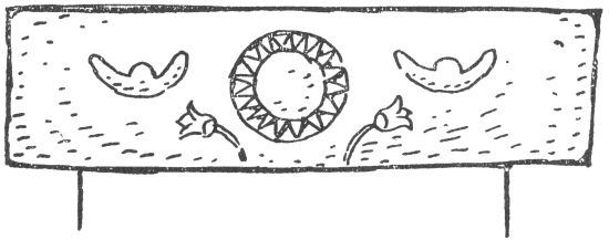 The cornice or arch of the door was at times only charged with a circular sun-disc, as that of the tomb at Shefa Amr, in Galilee, here figured. It was this tradition that was afterwards followed in the universal Syrian Christian custom of placing a disc with the sacred monogram or cross on the lintel, usually with ribbon-like appendages, right and left, which are direct survivals of the Egyptian uræus, that in a similar position accompanied the sun's orb. This becomes a