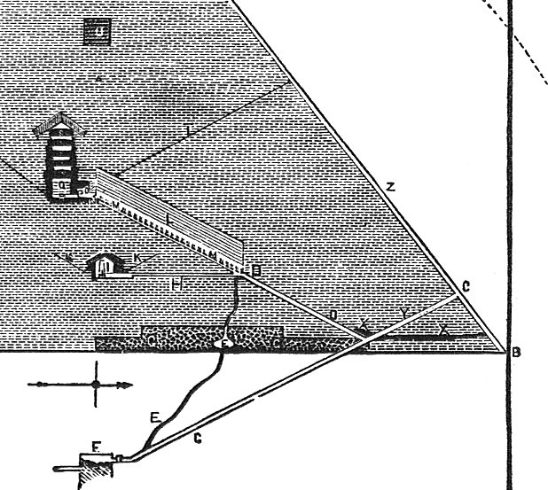 The shading in crossed lines indicates what parts of the Pyramid are red granite; the other portions, as far as known, are of limestone, of a color approaching yellowish-white.