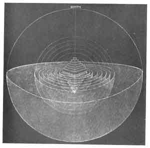 this figure. The upright central line represents the polar axis of the heavens and Earth in perpendicular position. The two central seven-staged pyramids represent the upper and lower halves of E-KUR, the Earth; the upper is the abode of living men, the lower the abode of the dead. The separating waters are the four seas. The seven dotted half circles above the Earth represent the "seven heavens," and the corresponding seven hemispheres below the earth, the "seven hells." The seven inner concentric spheres are respectively the domains and abodes of Sin, Shamash, Nabu, Ishtar, Nergal, Marduk, and Ninib, each being a "world-ruler" in his own planetary sphere. (The order of these spheres has been given above as Moon, Sun, Mercury, Venus, Mars, Jupiter, and Saturn.) The outer-most sphere (with its upper half cut away, as are the upper seven heavens, to show better the interior of the system) is the sphere of the antipodal gods, Anu and Ea, and the heaven of the fixed stars. It is to be noted further, Dr. Warren explains, that the spaces between the spheres widen rapidly at each remove from the Earth, so rapidly that in a world-view the size of this, they cannot be represented other than as in this plate.