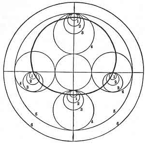 (2) and (4) and (5) revolve in the same period, that in which the centre of the epicycle performs a revolution; (3) revolves in half that time, while (6) revolves in the opposite direction with the same speed as the apogee of the excentric.