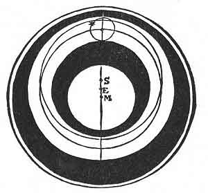 Dante's favorite description of the heavens was "wheels upon wheels," and Jagmini's diagram (Fig. 93) shows the "excentric wheel" of the Sun, itself a solid spherical body the edges of whose wheel touch two other surfaces, in the common centre of which is the Earth. But the centre of