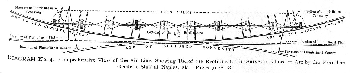 DIAGRAM No. 4. Comprehensive View of the Air Line, Showing Use of the Rectilineator in Survey of Chord of Arc by the Koreshan Geodetic Staff at Naples, Fla. Pages 39-42-181.
