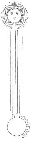 [267] The straight (horizontal) line is the earth----the nine lines drawn perpendicular to it are so many bodies standing each of them for one of the climates. The lines drawn from the sun to these bodies are the rays of the sun which, falling simultaneously upon the bodies on this and that side, produce the shadows as we have depicted them in ink. That particular line which descends straight down, since it falls upon the top of the body perpendicularly, produces no shadow for it is greater than the body and shines all round it.