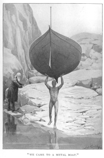 Proceeding farther along the edge of the lake we came to a metallic boat. This my guide picked up as easily as though it were of paper, for be it remembered that gravitation had slackened its hold here. Placing it upon the water, he stepped into it, and as directed I seated myself near the stern, my face to the bow, my back to the shore. The guide, directly in front of me, gently and very slowly moved a small lever that rested on a projection before him, and I gazed intently upon him as we sat together in silence. At last I became impatient, and asked him if we would not soon begin our journey.