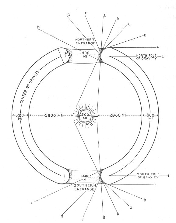 Diagram showing the earth as a hollow sphere with its polar openings and central sun. The letters at top and bottom of diagram indicate the various steps of an imaginary journey through the planet's interior. At the point marked "D" we catch our first glimpse of the corona of the central sun; at the point marked "E" we can see the central sun in its entirety.