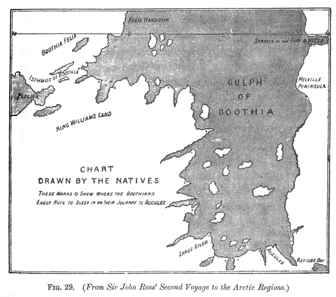 correct notion of the relative bearings of localities, but also to impart the idea lucidly to others, I annex a wood-cut of a chart drawn by them, impromptu, at the request of Sir J. Ross, who, inferentially, vouches for its accuracy.