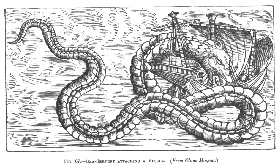 FIG. 67.SEA-SERPENT ATTACKING A VESSEL. (From Olaus Magnus).